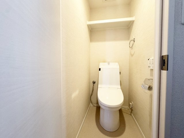 ウォシュレット付き高機能トイレ、上部収納はストックに便利です。