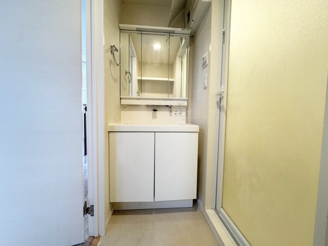 清潔感のある洗面所は三面鏡付きシャンプードレッサー、収納力のある洗面台です。