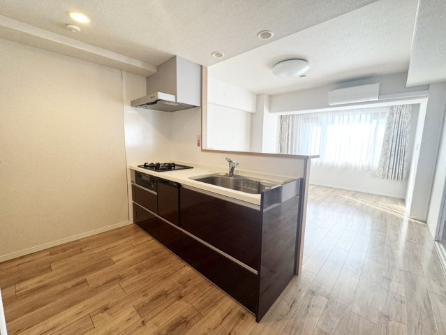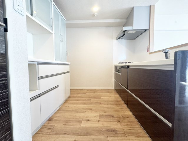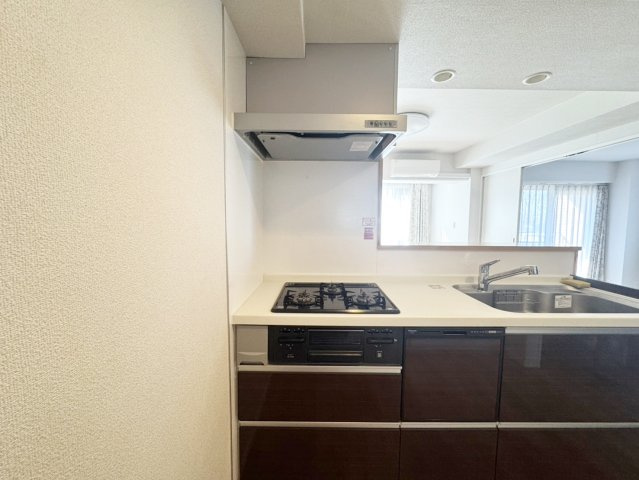 食洗器を備えたシステムキッチンは、三口コンロもうれしいポイント。忙しい日も家事を時短できる、主婦の味方です。