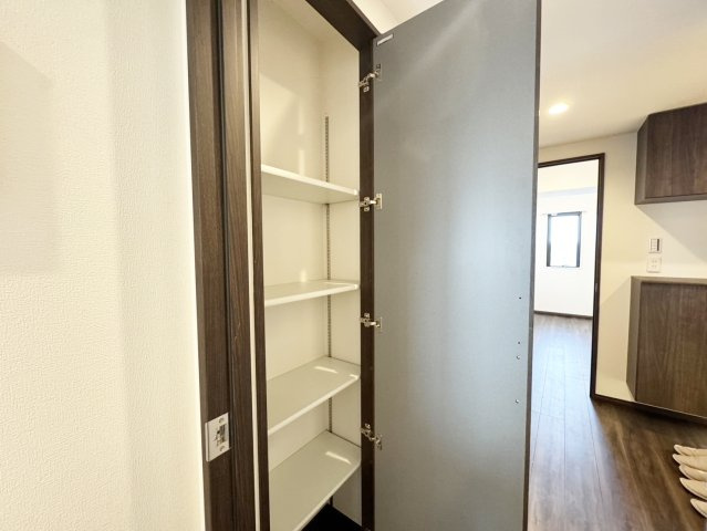 玄関横にも収納がありストックの管理もしやすくまとめ買いで時短につながります。