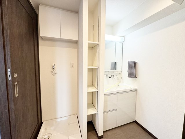 洗面所も収納付きです。 タオルやパジャマなどその場で取り出せるので小さなお子様がいても着替えやすいですね。