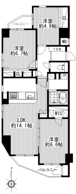 76.95㎡、3LDK。使いやすい間取りで個人のプライベートの確保も出来ます