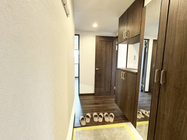 シックでおしゃれな玄関には大きなシューズクローゼットを完備、鏡付きでお出かけ前の最終確認を◎
