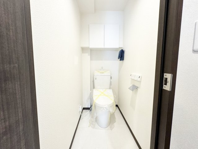 ウォシュレット付き高機能トイレ、上部収納はストックに便利です。